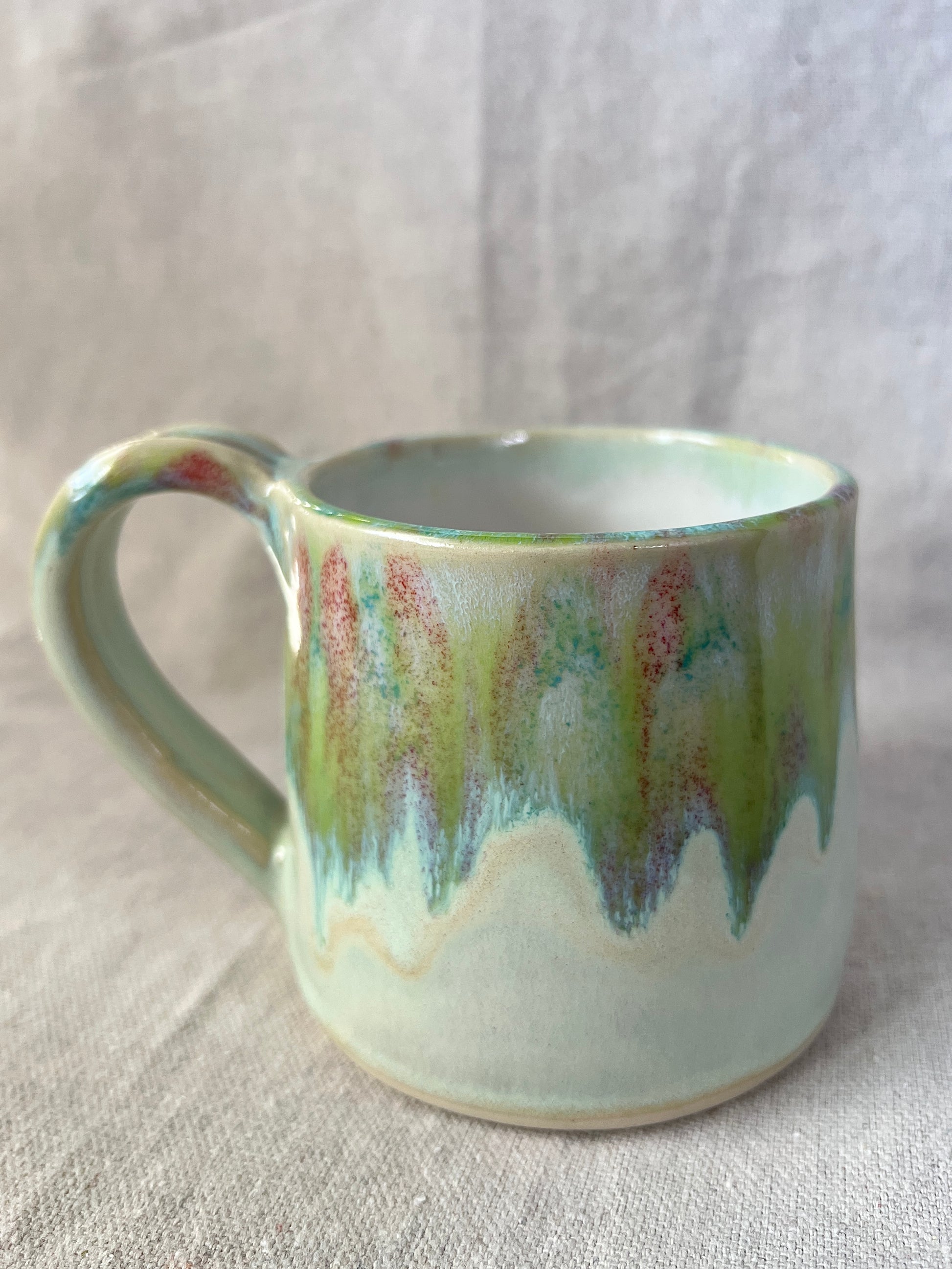 Hand-built from light-colored stoneware clay to hold 12 oz. Approx 3.25" tall x 3.5" in diameter not including handle.