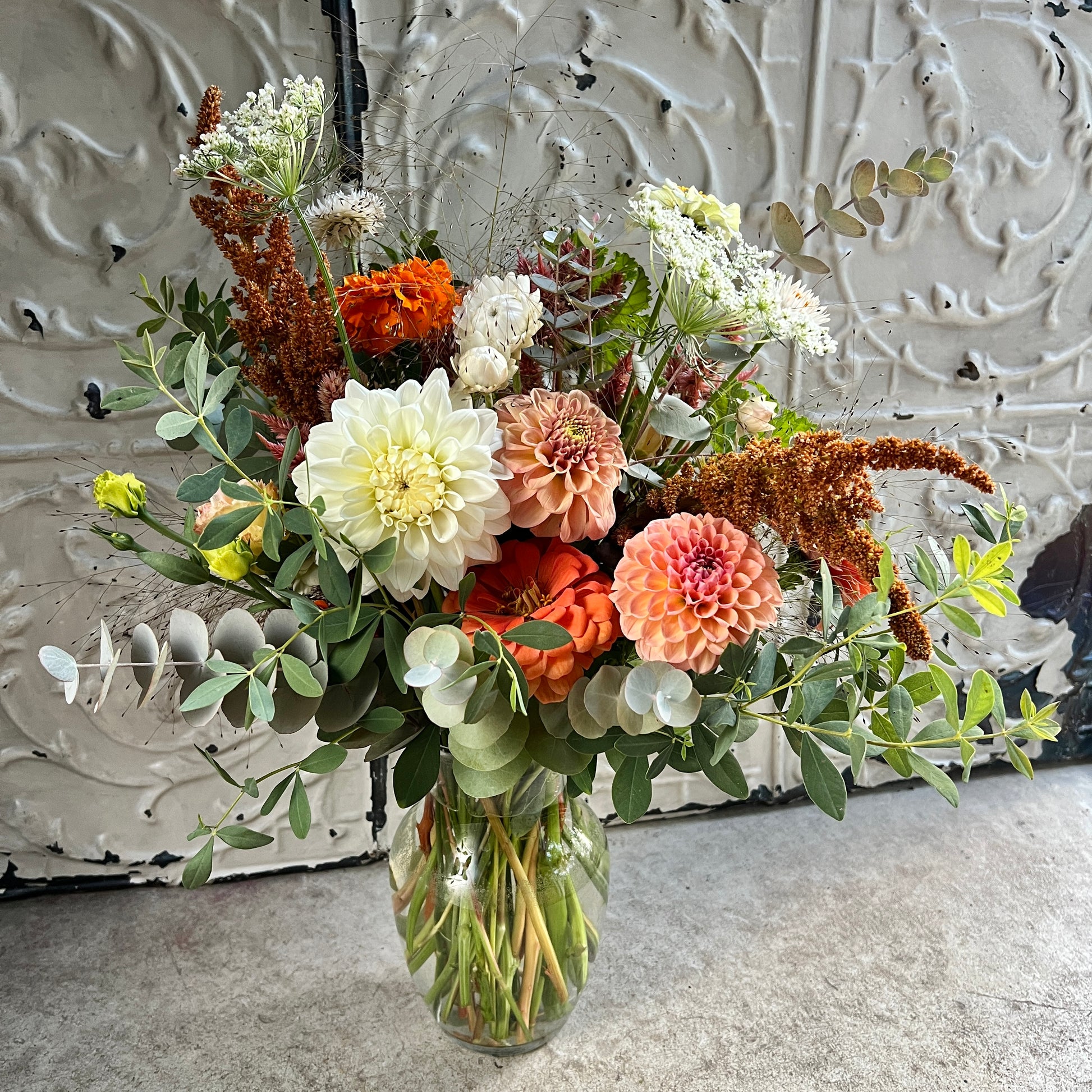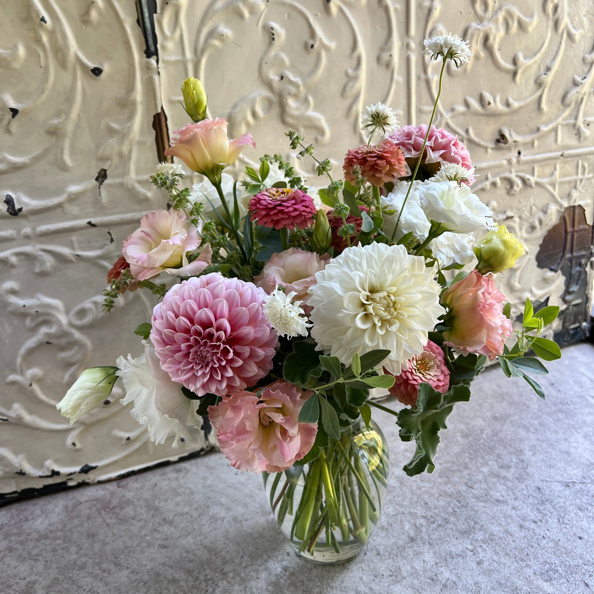 I create arrangements using only the best of the specialty cut flowers grown here on my micro flower farm. Varieties and colors are grower's choice based on what's available to harvest at the time of your order.